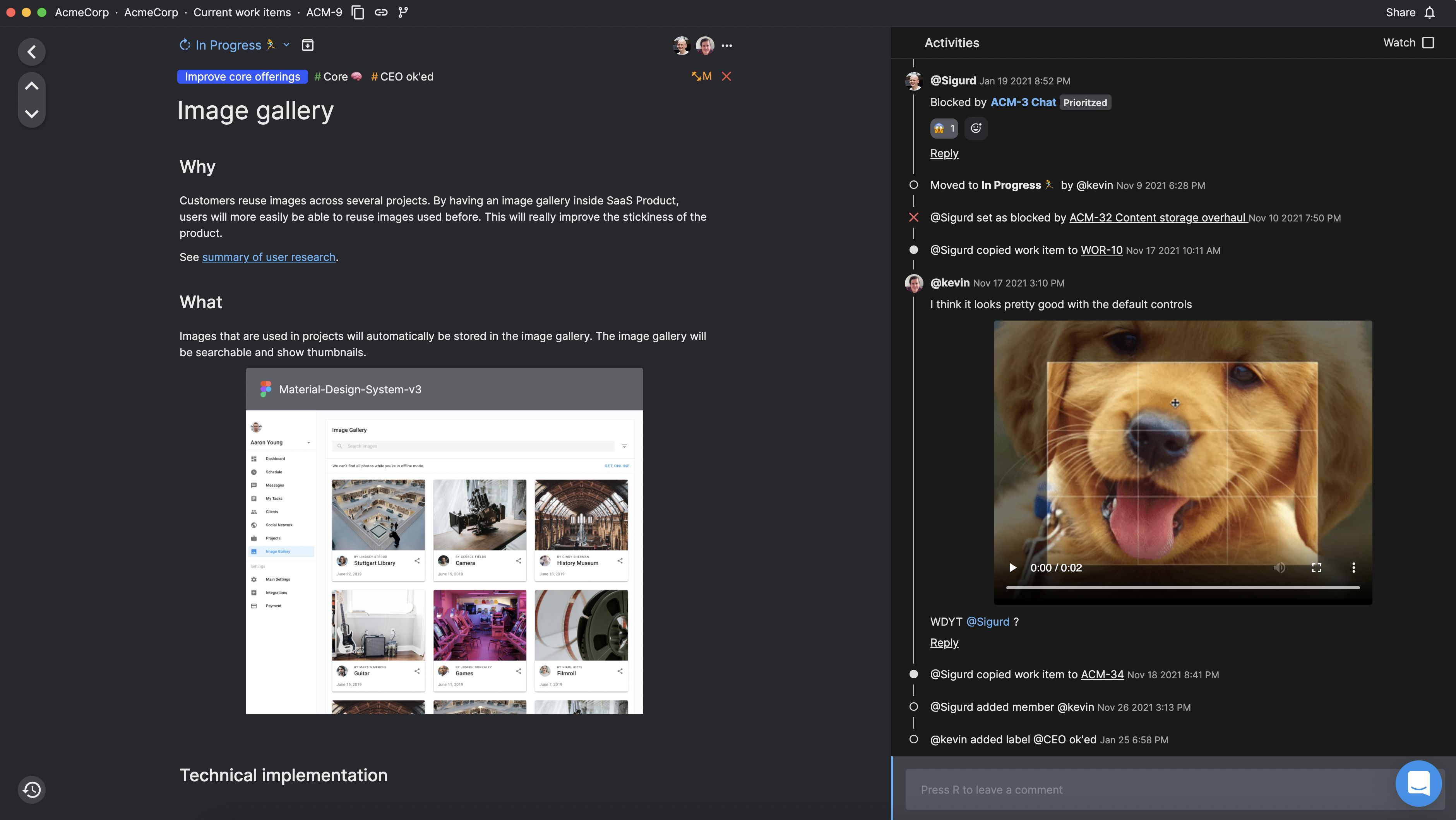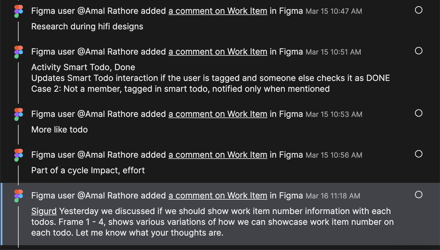 If you put a Figma design in the description, the preview of the designs will automatically be updated (notice it may take a few minutes for Kitemaker to catch changes). In addition, new comments will appear in the activity feed, and the members of the work item will be notified. This is a great way to ensure that no one misses out on relevant discussions, particularly engineers that might not go to Figma regularly.